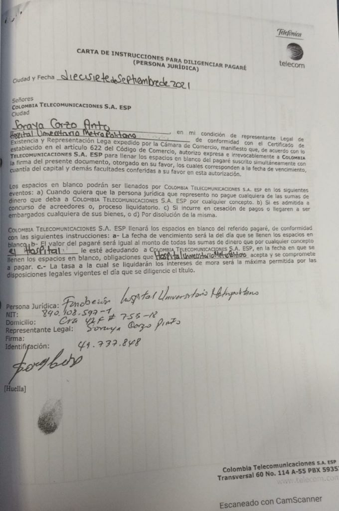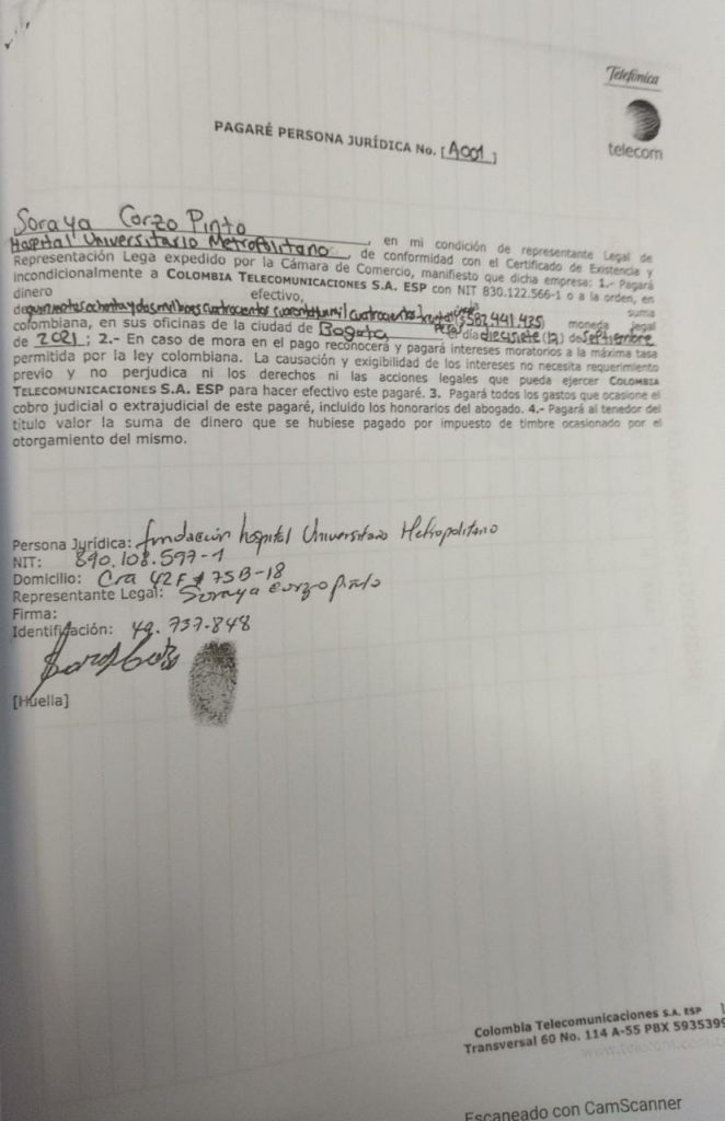 Colombia Telecomunicaciones S.A aportó un Pagaré firmado por SORAYA CORZO PINTO y que habia sido firmado el 17 de Septiembre del año 2021 , lo cual es totalmente falso e ilegal.